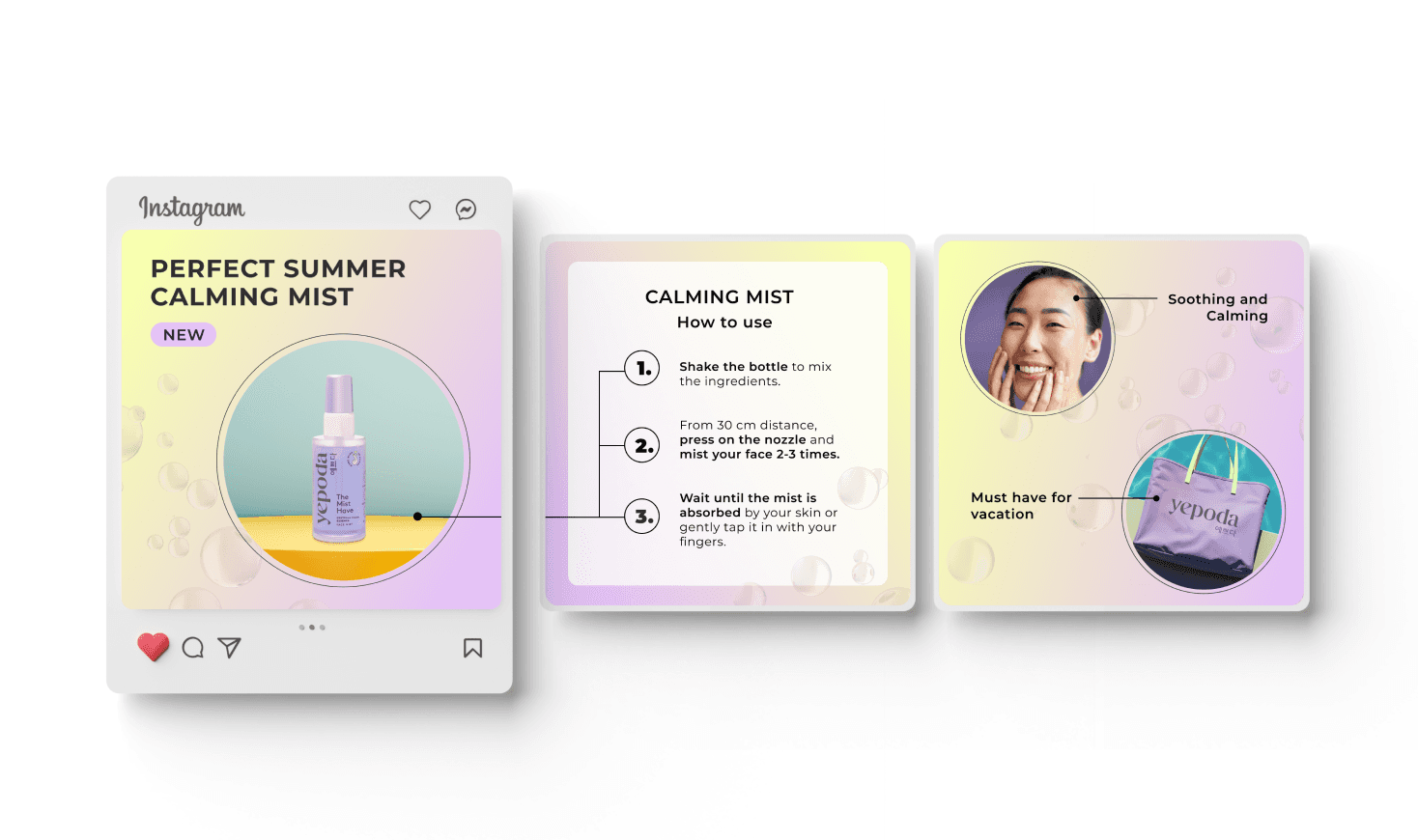 Additionally, a carousel post will provide more product explanations. The first image in the carousel will be the main visual similar to the primary campaign image but with slight variations to maintain interest. The second image will offer a detailed guide on how to use the product, ensuring customers understand its application. The third image will highlight additional product benefits, giving users a comprehensive understanding of the value the product offers. This approach not only educates the audience but also keeps them engaged with visually appealing content that aligns with Yepoda's brand aesthetics.