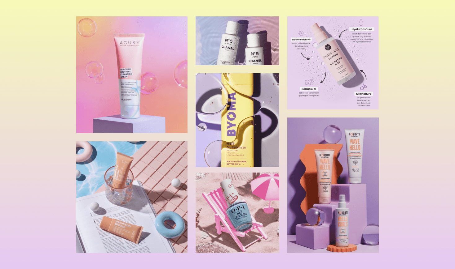 The mood board showcases a series of product-focused images, utilizing a vibrant palette of violet and yellow. Each shot prominently centers the product, enhanced by gradients, beach-inspired themes, and light textures like water, bubbles, and water drops. Centered Focus: The face mist should always be the central focal point in every image, ensuring it draws immediate attention. Surrounding Elements: Incorporate props such as tropical leaves and reflective surfaces to amplify the summer vibe and add visual depth to the composition. Water Elements: Integrate water drops, bubbles, and splashes to emphasize the hydrating and refreshing qualities of the Calm mist, enhancing its appeal.